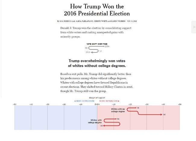 这次美国总统选举像一部连续剧,主角不断向下沉沦,到了大结局这天,大家已经不在乎谁是好人谁是坏人,这种非理性的选举,结果很难预测。《纽约时报》根据选举结果的数据调查分析,特朗普当选有四个原因: