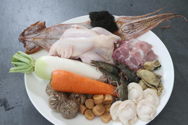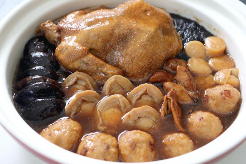 这道菜除了结合海味的鲜甜与童子鸡的嫩滑肉质,曾繁基师傅还加了一些手打肉丸,让弹牙的肉丸增添年菜的层次感。
