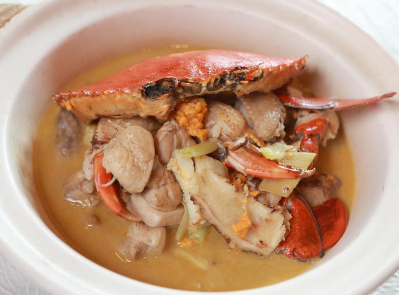 梁志贤师傅说:“鸡肉比蟹慢熟,先爆香姜片才放入鸡炒出水分,再加少许油,放入蟹继续爆炒至蟹变红色,才下酒和加鸡汤焖煮。”