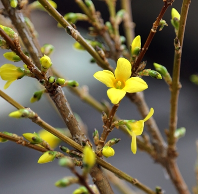 近年看到的剪枝年花连翘也常被冠错名,被误为“迎春花”。许梦丰说,迎春花和连翘虽都开黄花,但迎春花是爬藤科,花有五瓣,连翘是直挺枝条的灌木科,花为四瓣。连翘开在冬春之间,其果可解毒,是“银翘解毒片”的材料之一。