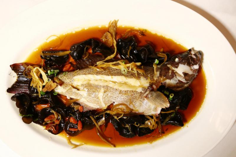 - 金针菇、黑木耳,红枣用酱青、酱油、鸡精粉、糖、胡椒粉等调味捞匀, 然后铺在已洗干净的石斑鱼上。