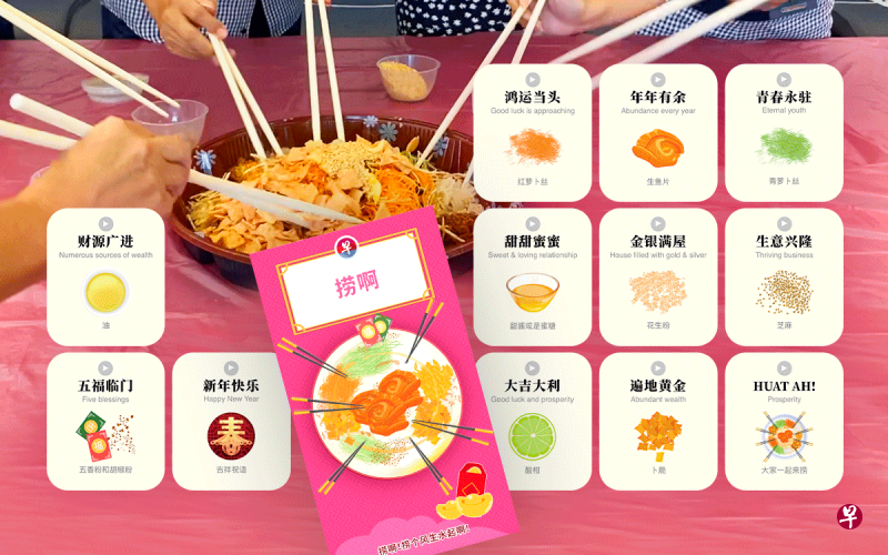 他也表示,自己特意将祝语依照捞生材料的倒入顺序做排列,还附上了英文解释,帮助不熟悉捞起仪式,或不庆祝农历新年的用户能通过应用了解这项习俗。