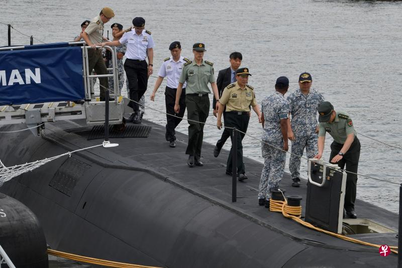 魏凤和昨天参观了新加坡号—樟宜海军基地,参观了我国海军的忠诚号隐形护卫舰(RSS Stalwart)和剑客号(RSS Swordsman)潜艇,并听取关于海军部队资信汇合中心(Information Fusion Centre)的简报,了解该中心对海事安全所作的贡献。图为魏凤和(右四)上将在我国三军总长王赐吉中将(左一)的陪同下,登上剑客号参观。(国防部提供)