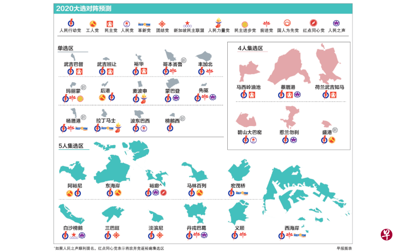 《联合早报》根据各政党的宣布以及在选区内的活动,整理出对阵预测表。哥本峇鲁、玛丽蒙、杨厝港三个新划分的单选区,以及蒙巴登和拉丁马士两个原有的单选区都有可能出现三角战。