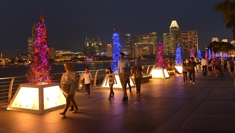 没有人造雪或室内冷气,沿着新加坡河观赏两岸的灯饰,感受不一样的热带圣诞。新加坡河畔所进行的“Christmas by the River”除了将河岸两旁的走道披上璀璨灯饰,也善用新加坡的地理优势,举办特别的河上歌咏表演和音乐演出,让原本就热闹的克拉码头和罗拔申码头更添精彩。