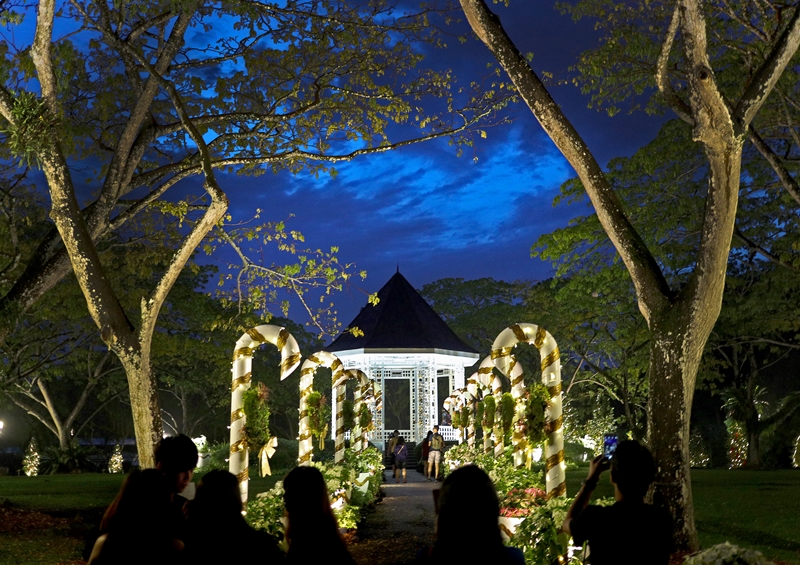 圣诞树装饰林林种种,从汽水罐到寄语卡片都有,让人感受浓浓圣诞节气息。植物园的其中一个热门景点——演奏台(Bandstand)更是经过精心设计,有巨型拐杖糖在走到两旁,气氛浪漫。