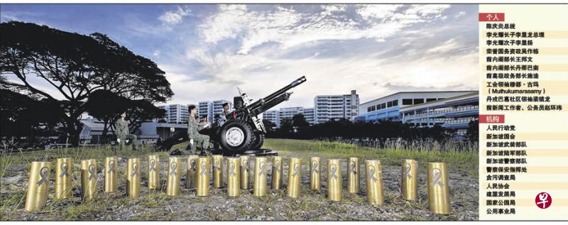 2015年3月29日,当建国总理李光耀的灵柩离开国会大厦后缓缓经过政府大厦前大草场时,陆军21响礼炮开始鸣放,向李光耀致以最高敬意。近一年后,在各界计划以不同方式纪念这位建国元勋之际,21个炮弹弹壳分别送给了21个机构和个人,当中包括在国葬仪式上宣读悼词的人、负责组织国葬以及多个与李光耀关系密切的机构。