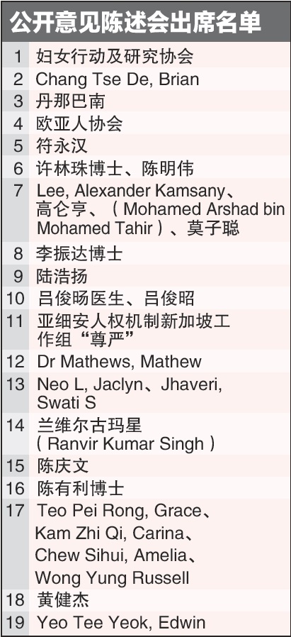 当中包括前内阁部长丹那巴南(S Dhanabalan)、学者如新加坡管理大学法律系副教授陈庆文、新加坡国立大学李光耀公共政策学院政策研究所副所长许林珠博士和宪法专家陈有利博士,以及妇女行动及研究协会(AWARE)和亚细安人权机制新加坡工作组“尊严”(MARUAH)等个团体。