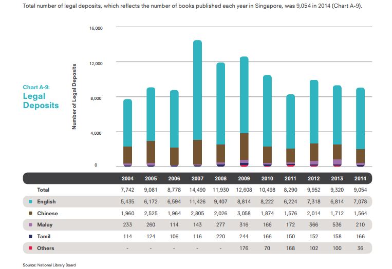 根据国家艺术理事会的年度报告,最新的统计数据是在2014年,那年本地有9054份出版物,相当于平均一天25本。2014年的华文出版物则有1564份,平均每天四本。