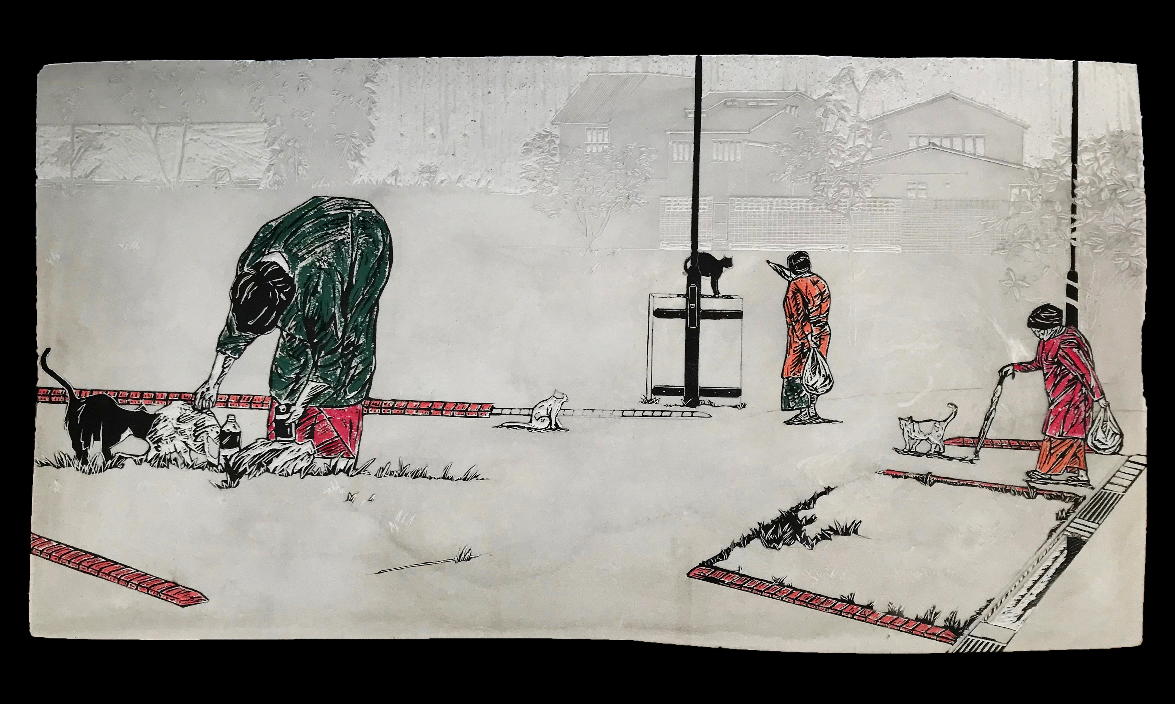 她取材组屋区生活特色与有趣的细节,如停车场、走道、窗口、烧金纸桶等,采用水泥和细沙作刻板,因为组屋就是混凝土建筑。林加淇实验的水泥版画放久了会裂,她也得找到对的方程式以解决难题。