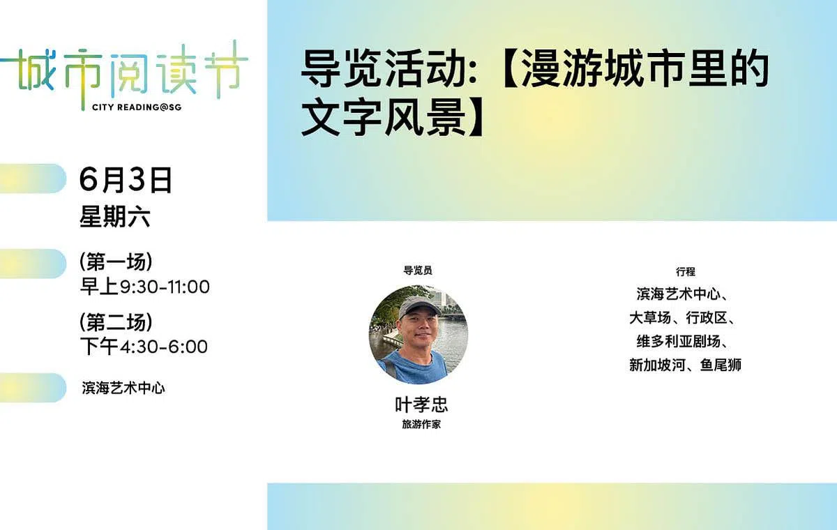 由滨海艺术中心开始,步行到大草场,再经过行政区,维多利亚剧场,最后沿着新加坡河漫步到鱼尾狮公园欣赏标志性的雕像。参与者能跟着旅游作家叶孝忠的导览,一起探索滨海艺术中心及周边,听听他们的历史故事,并一起挖掘出属于它们的文字风景。