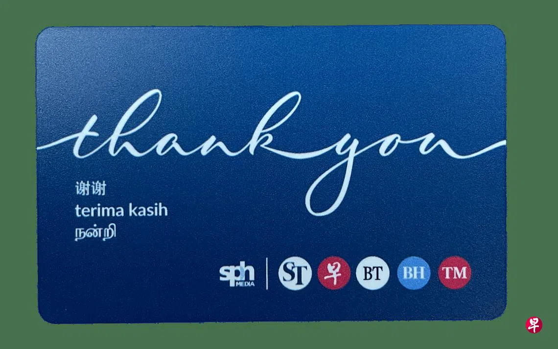 万捷通卡将以礼品信封的形式送出,内附有《联合早报》总编辑吴新迪的致谢语: