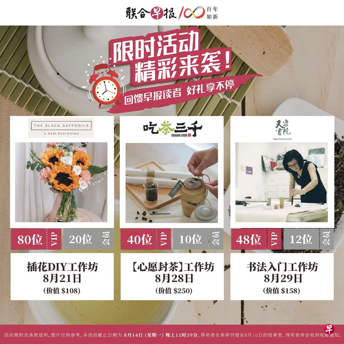 此活动开放给早报VIP与会员报名。早报VIP与会员只须点击链接,回答几道简单问题,就有机会赢取其中一个工作坊体验!活动将于8月14日 (星期一)截止。得奖者名单将刊登于8月16日的报章,得奖者也将收到电邮通知。