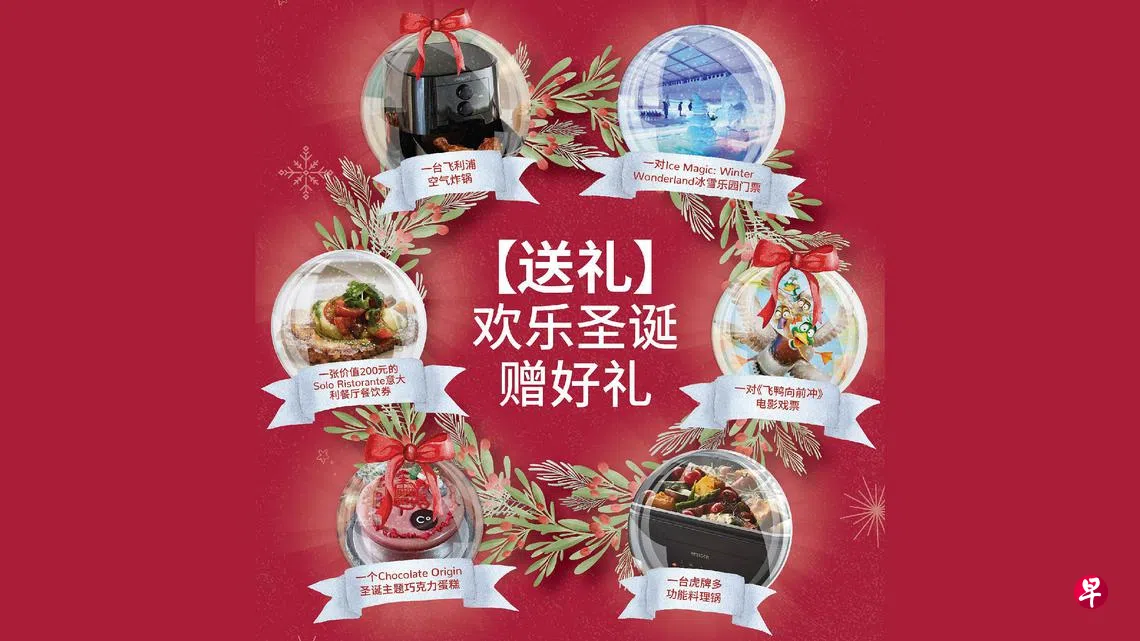 来临的圣诞佳节,早报VIP将有机会赢取价值超过5000元的惊喜礼品!除了有适合阖家共赏的电影、冰雪乐园入场券、蛋糕、餐馆美食体验等,还有烹饪电器,让您过个丰富多彩的圣诞节!