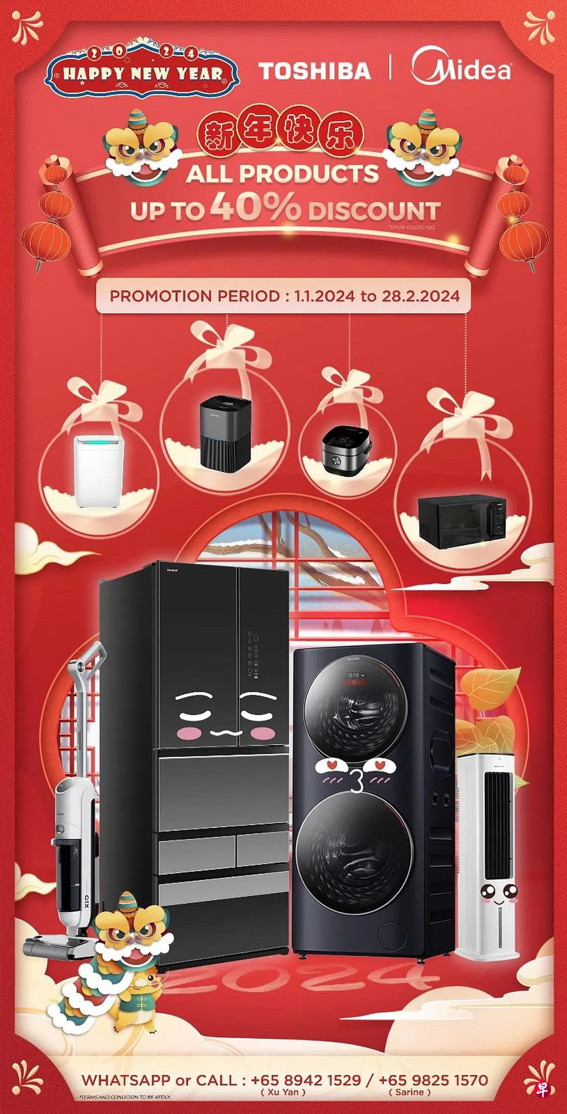 为了迎接农历新年,东芝和美的品牌为早报VIP准备了新年家电优惠!这些家电产品包括崭新的电冰箱、洗衣机、微波炉和吸尘机等,将在Lorong Chuan New Tech Park展厅内出售。