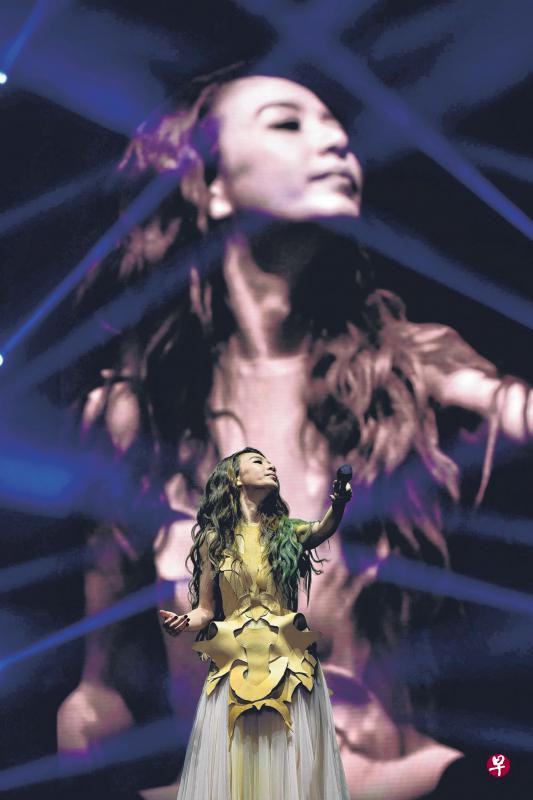 演唱会的另一个亮点是布满植物装饰的10米高“天空之岛”高台,Hebe坐在上面犹如森林精灵与歌迷互动。她笑说虽然自己的“小岛花园”比不上新加坡植物园,不过它却是独一无二的。她接着感慨地说,虽然天生害羞内向,但有机会成为歌手是一件很幸福的事。
