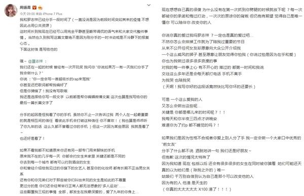 周扬青的信一开始就交代“一直没说是因为前段时间突如其来的疫情不想因此佔用公共资源”,同时强调分手时间已经长到不是“不冷静的报复心态”。(御姐爱写到这里,调侃了一下说:“对,其实是冷静的报复。”)当大家不认为自己是在看一个失恋失控的人写的信时,信中后续的论述才会受到信任。