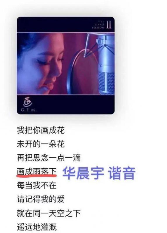 不久邓紫棋发了一首歌《画》,歌词:“我把你画成花 / 未开的一朵花 / 再把思念一点一滴画成雨落下 / 每当我不在 / 请记得我的爱 / 就在同一天空之下 / 遥远地灌溉 / 等待秋去春来。”心思细腻的网民看到她在社交媒体的一幅画,称那是“花晨雨”,跟歌词里的“画成雨”,不是都在呼应着“华晨宇”吗?