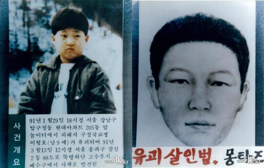 同样发生在1991年年初,公诉时效于2006年结束,此案主角李亨浩事发当年只有9岁,家住首尔狎鸥亭,最后被目击在家附近的游乐场出现。事发后43天,李亨浩的尸身于蚕室大桥附近的汉江边排水道被寻获,他的眼、耳、口及四肢均被胶纸封着或捆绑,死因为窒息。
