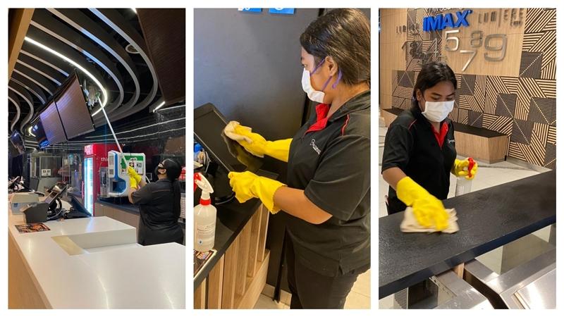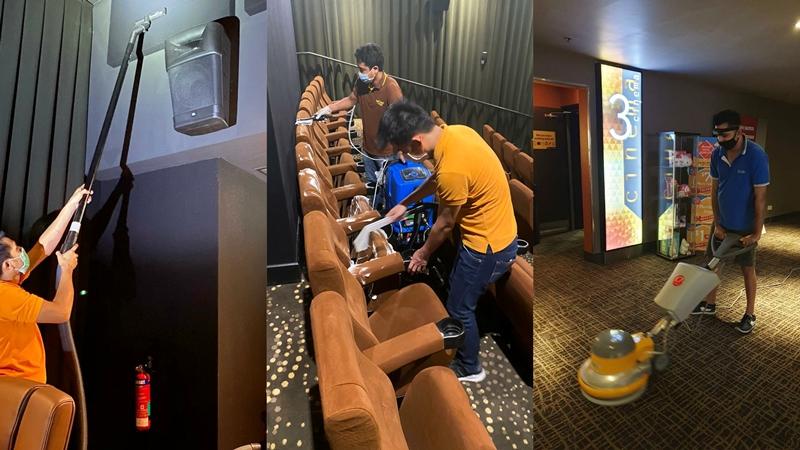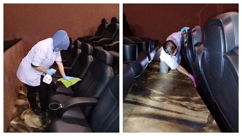疫情期间各商家加强消毒,电影院休业超过100天,消毒工作更彻底:从柜台、自动购票机、影院椅子到各影院的隔音墙,所有硬件都得洗一遍。