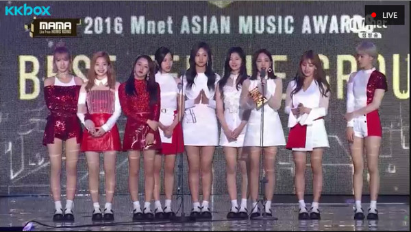 最佳女子组合则由出道才一年的TWICE夺下,成员们一开始听到获奖,都还呆愣愣地坐在原地不敢相信,后来在粉丝的大声欢呼下走上台领奖,站定大势女团地位。TWICE也以“Cheer Up”夺得最佳年度歌曲大奖。