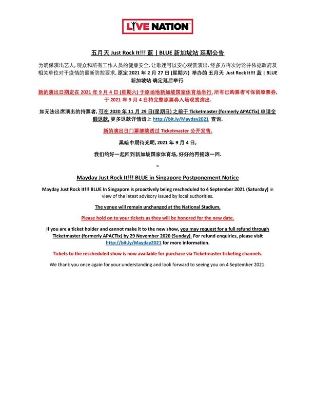 五月天 Just Rock It!!! 蓝 | BLUE 新加坡站 延期至2021九月五月天 Just Rock It!!! 蓝 原定于2021年2月27日(星期六)举行的五月天 Just Rock It!!! 蓝 | BLUE 新加坡站将展延至同年9月4日(星期六)于同一个场地举行。这是演唱会由于疫情第二次延期。完整公告内容如下:更多详情可上Live Nation官网查询。购买此文章