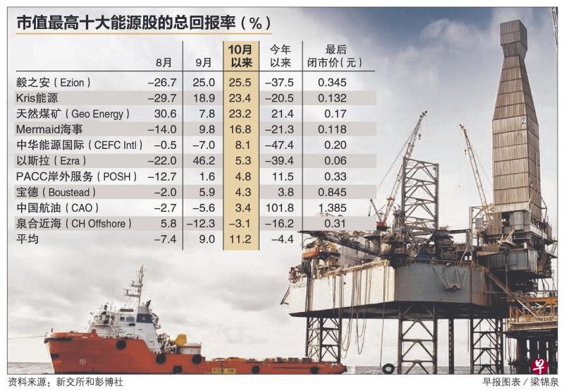 据新加坡交易所投资者教育网站(SGX My Gateway)的资料,市值最高的十大能源股在7月和8月的总回报是负9.8%和负7.4%,到了9月成功扭转劣势,取得9%正回报。进入10月的首五个交易日,十大能源股的总回报达11.2%。