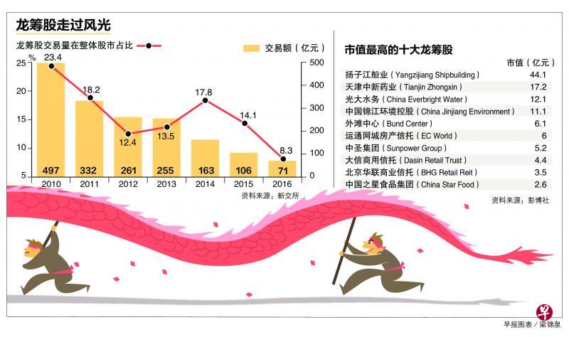 龙筹股占新加坡交易所(SGX)挂牌公司市值约15%,但“江湖地位”大不如前,这几年不少龙筹股停牌或退市,对整体股市交易量贡献不到一成。