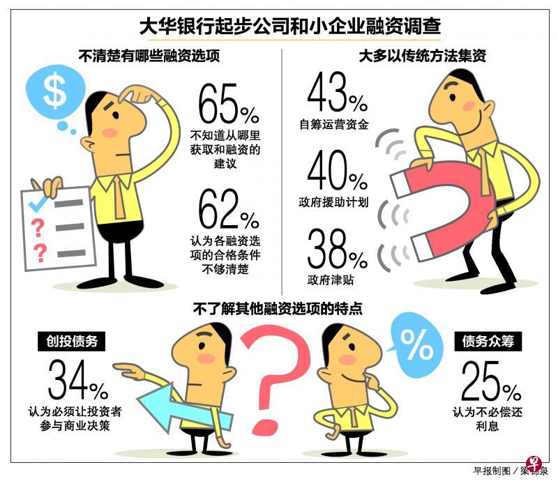 大华银行(UOB)昨天发表的《起步公司和小企业融资调查》显示,65%的本地起步公司和小企业不知道从哪里获取和融资有关的建议;62%认为各融资选项的合格条件不够清楚。