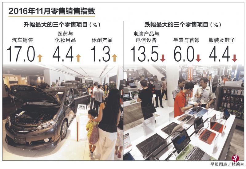增幅最大的是汽车销售,同比增加17%,这也带动11月份指数取得增长。其他出现增长的是医药与化妆用品、休闲产品,以及眼镜产品与书籍,增幅介于0.3%至4.4%。