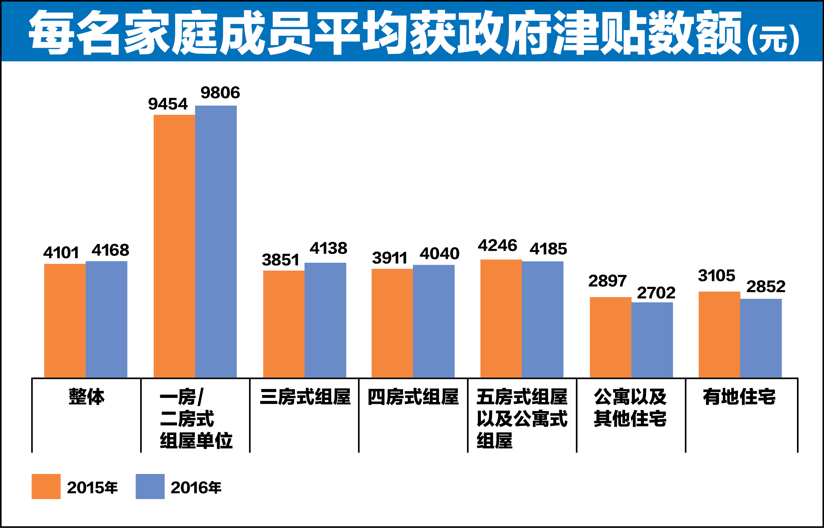 当然,真正需要帮助的家庭去年也获得更多政府补助。报告显示,住在一房式与二房式组屋的家庭获得最多补助津贴,而且与前年的9454元相比,去年每名家庭成员平均获得的津贴数额增加到了9806元,比住在其它住屋类型的居民获得的津贴多一倍或以上。