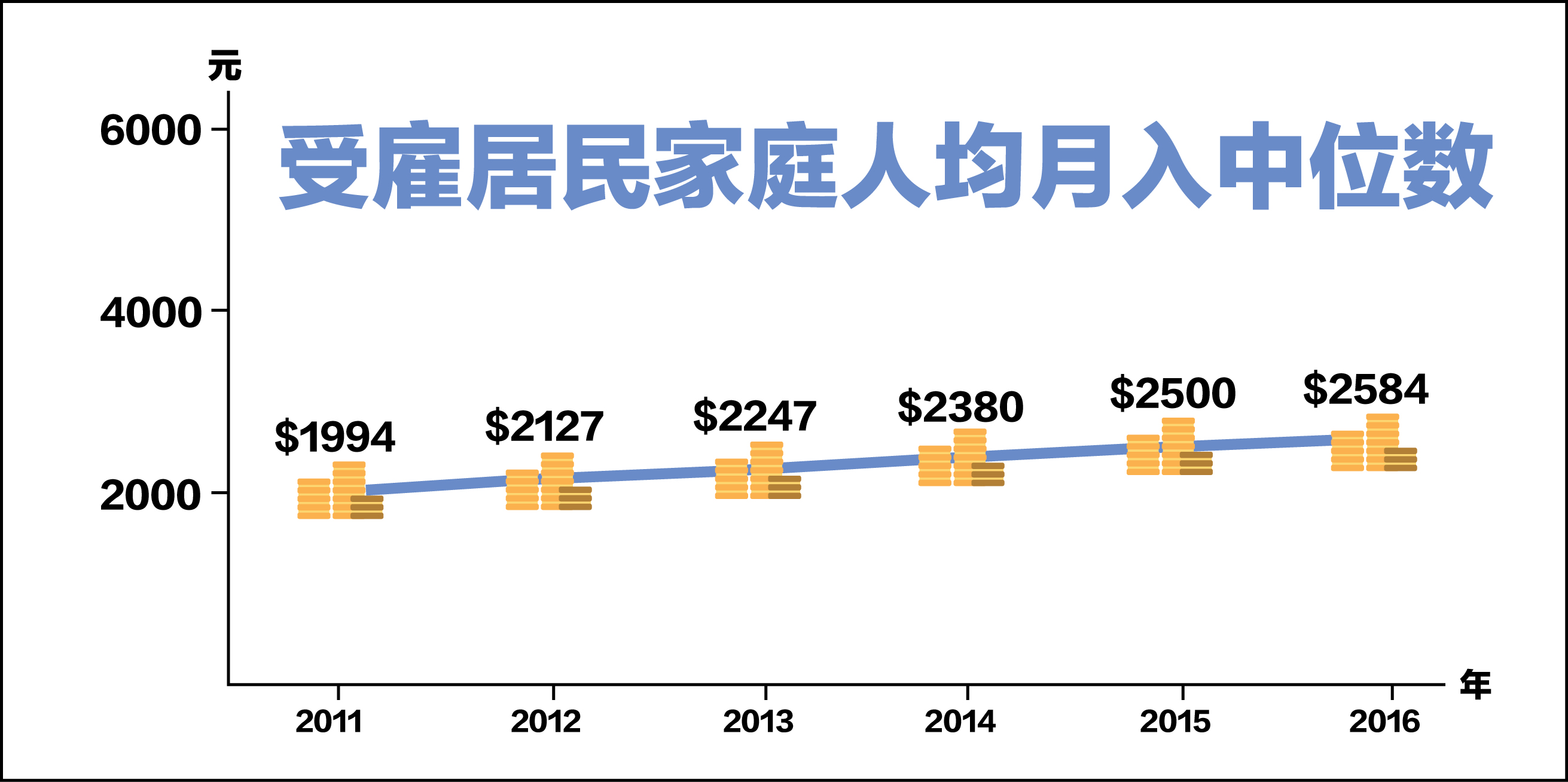 本地受雇居民家庭的月入中位数在2016年提高了。最新数据显示,本地家庭每月从工作所得的收入中位数从2015年的8666元增至去年的8846元,扣除通胀的实际增幅为2.6%。基于去年经济放缓以及家庭结构的变化,增幅比前年的4.9%少了将近一半。