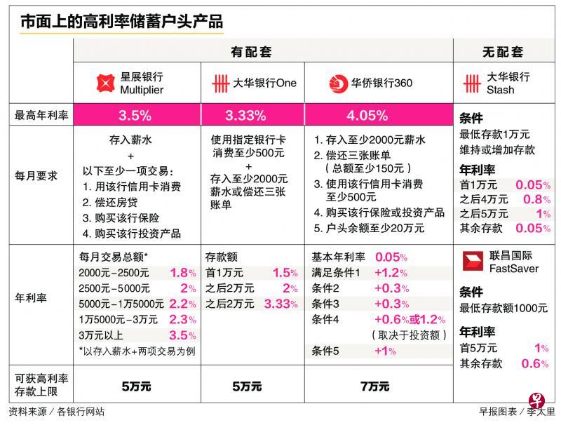2014年推出的Multiplier户头,是本地银行中首个高利率储蓄户头配套产品。华侨银行(OCBC)和大华银行(UOB)随后也推出360户头和One户头配套。这类配套若满足一定条件,至少可享有1%以上,甚至超过3%的利率,深受消费者欢迎。