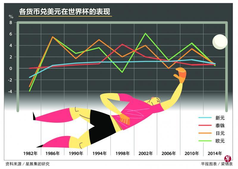 配合世界杯开打,星展集团研究发布了一份世界杯与金融市场关系的报告。根据报告,自1986年开始,新元兑美元走势,在每一场世界杯进行的四个星期内表现都良好。