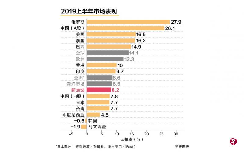 今年首六个月的市场回报率排行榜,俄罗斯、中国与美国分别拿下状元、榜眼和探花;垫底的则是马来西亚、韩国和印度尼西亚。