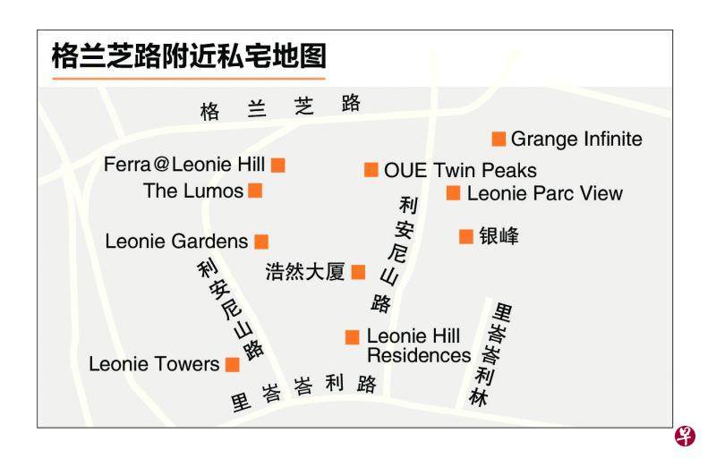 Grange Infinite(2011年竣工) 一年来没有交易。Leonie Parc View(2009年竣工)有两个面积为2013平方英尺的单位售出,价格分别是421万元于422万8000元,相等于每平方英尺2092元与2100元。这两个项目都属于永久地契