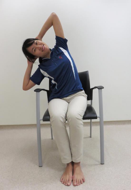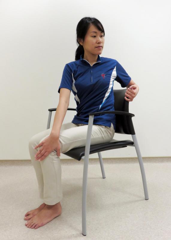 2b、将身体转向一侧,用手扶椅背固定。保持这个动作10秒。应感到脊椎伸展的舒畅感。左右各做10次。