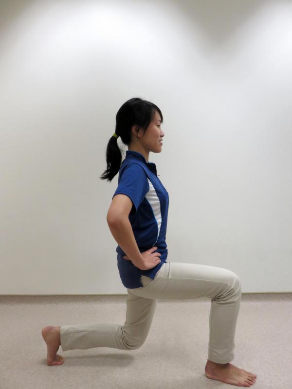 3b、一脚踏前伏低。注意前脚膝盖和第二根脚趾保持一条线,后脚脚趾弯曲,膝盖不碰地;保持身体笔直。左右各做8次。