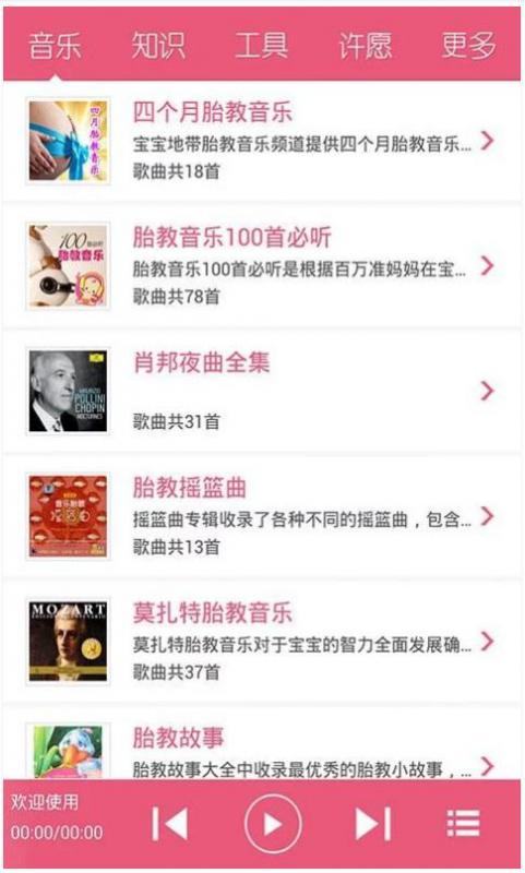 此应用就为准妈妈们提供胎教音乐、手工胎教、亲子胎教等内容,还可以根据预产期推荐不同胎教音乐。