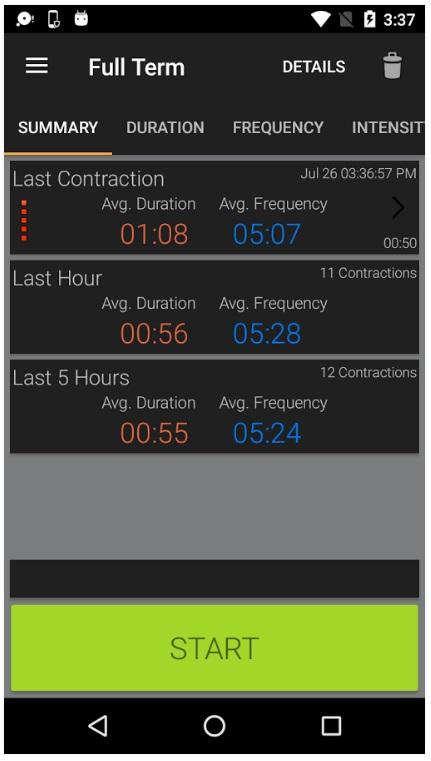 第二部分是宫缩计时器,孕妇每一次感觉到宫缩就点击“开始”的按钮,宫缩停止就点击“结束”。此应用会将孕妇的宫缩频率和强弱度制作成图表,孕妇不会因为太慌张而记错间隔与宫缩的时间,医疗人员也一览无遗。