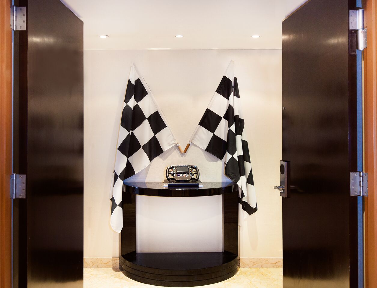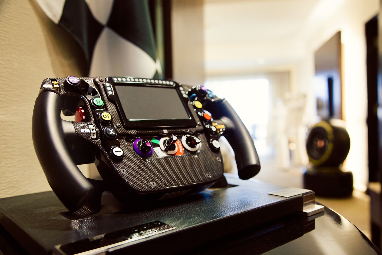 一踏进这个以F1赛车为主题的套房里,你就能看到限量的迈凯伦-本田赛车方向盘。
