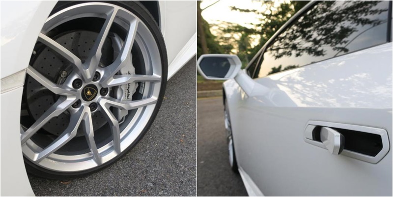 跑车采用隐藏把手的侧拉门设计,不仅让外形更酷炫,在一定程度上降低了高速行驶时的风阻系数。后视镜采用与Aventador相似的设计,内侧是形状独特的后视镜镜片。