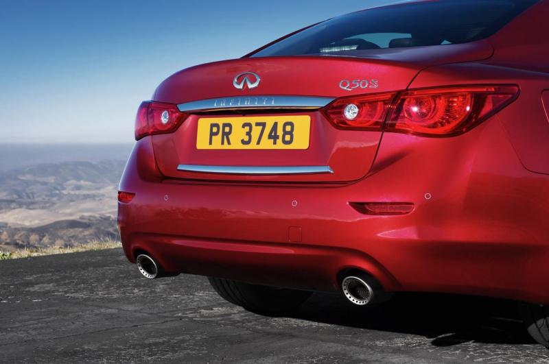 代号Q50S的英菲尼迪(Infiniti)Q50 Red Sport 400车型与普通版车型的造型相似,不少设计元素基于Essence概念车,线条犀利,看起来更有冲劲和运动感。车头最显眼的是车鼻大型的黑色网状前格栅,采用双拱形水波纹进气格栅,并重新修饰了前保杆。四门车身有弯曲流线,拱形车顶轮廓线缓缓延伸至车侧弯月形C柱,不仅营造了波浪视觉效果,车头车尾更兼具空气动力学设计,全面提升抓地力和掌控力。暗黑色的19英寸轮圈更具动感,也换上特制的排气系统与尾饰管前翼子板,另外尾部有Q50S的代号,为新添元素。