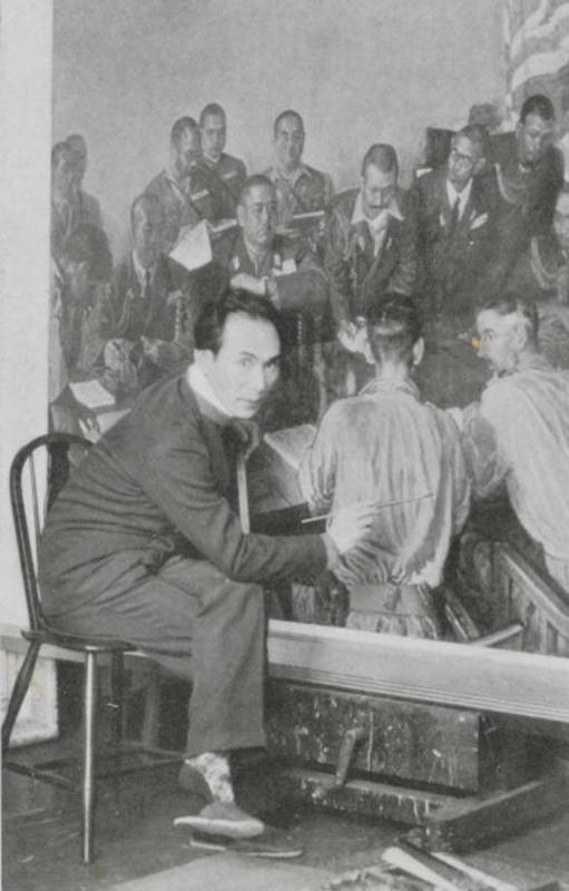 据估计,日本陆军和海军的从军画家超过200名,他们的领头羊就是著名的滕田嗣治(Tsuguharu Fujita,1886-1968,战后遭艺术界谴责为“战犯画家”,移民归化法国,改叫Leonard Foujita)。滕田的最佳搭档就是宫本三郎(Saburo Miyamoto,1905-1974)。
