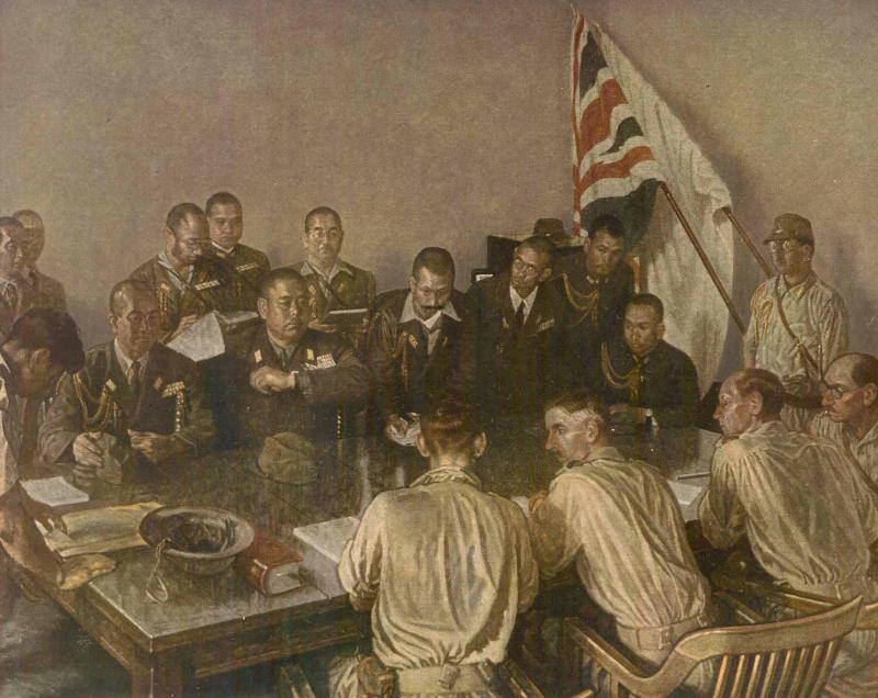 当然,也就在昭南岛上,宫本勾画出了他的成名作《山下接见白思华司令投降图》(宽2.255米,高1.807米)。