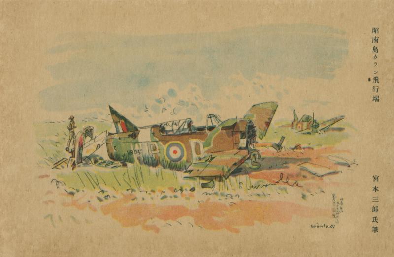宫本三郎的《加冷机场的敌军残骸》,清水登之(Toshi Shimizu,1887-1945)的《昭南三巴旺附近的敌机》,这两幅水彩画告诉了我们一个惨痛的事实,那就是在战争中一旦失去控制权,这就是下场。