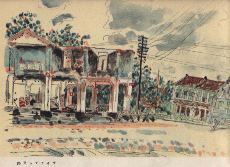 曾被英军顽强抵抗了一两天的几处“激战地”,当然也是要大大宣传的画题。武吉知马三叉路,就是日军恨之入骨的地方之一,宫本为此留下了一幅水彩素描。