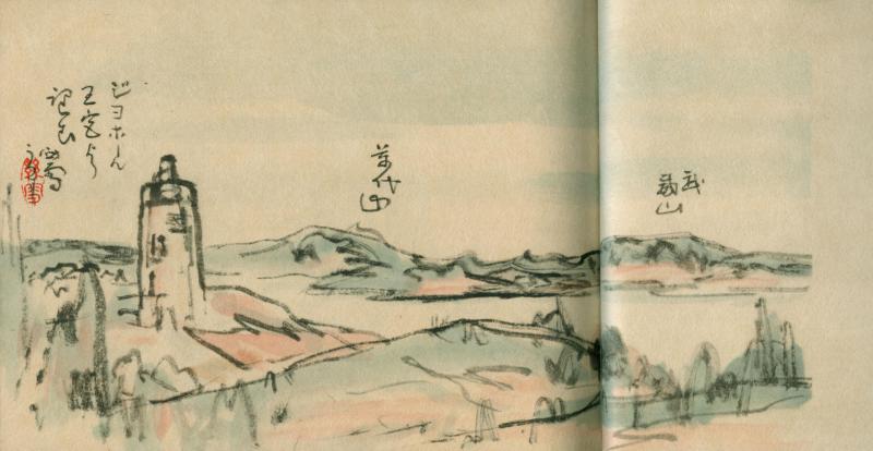 擅画山水的桥本关雪(Kansetsu Hashimoto,1883-1945)在1943年5月出版的《翱翔南方》画册里,有一幅名为《从柔佛王宫遥望》的横幅,画中昭南岛上的两座山丘分别被日军改名为“万代山”与“武山威”,即万里山和武吉知马山也!
