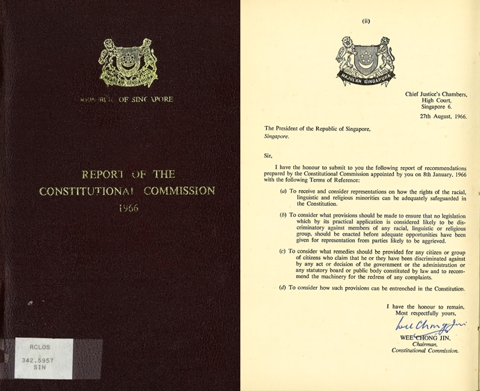 1966年12月完成的这份黄宗仁宪法委员会报告(Wee Chong Jin Constitutional Commission Report)旨在保护和保障不同种族、不同宗教和不同语言新加坡人的权益,在宪法规定上避免对任何一个民族过度偏袒,保证新加坡是个平等的国家。因此文件中建议国会不要设立有任何偏向的宪法,确保新加坡的种族、宗教平等。这份文件影响深远,为今天的多元新加坡奠定了非常重要的基础。