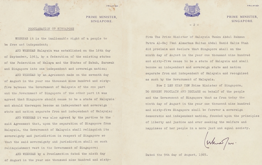新加坡历史上最重要的宪法文件莫过于1965年8月9日颁布的《新加坡共和国宣言》(Proclamation of the Republic of Singapore)。宣言由首位律政部长巴克草拟,上面有建国总理李光耀的签名。